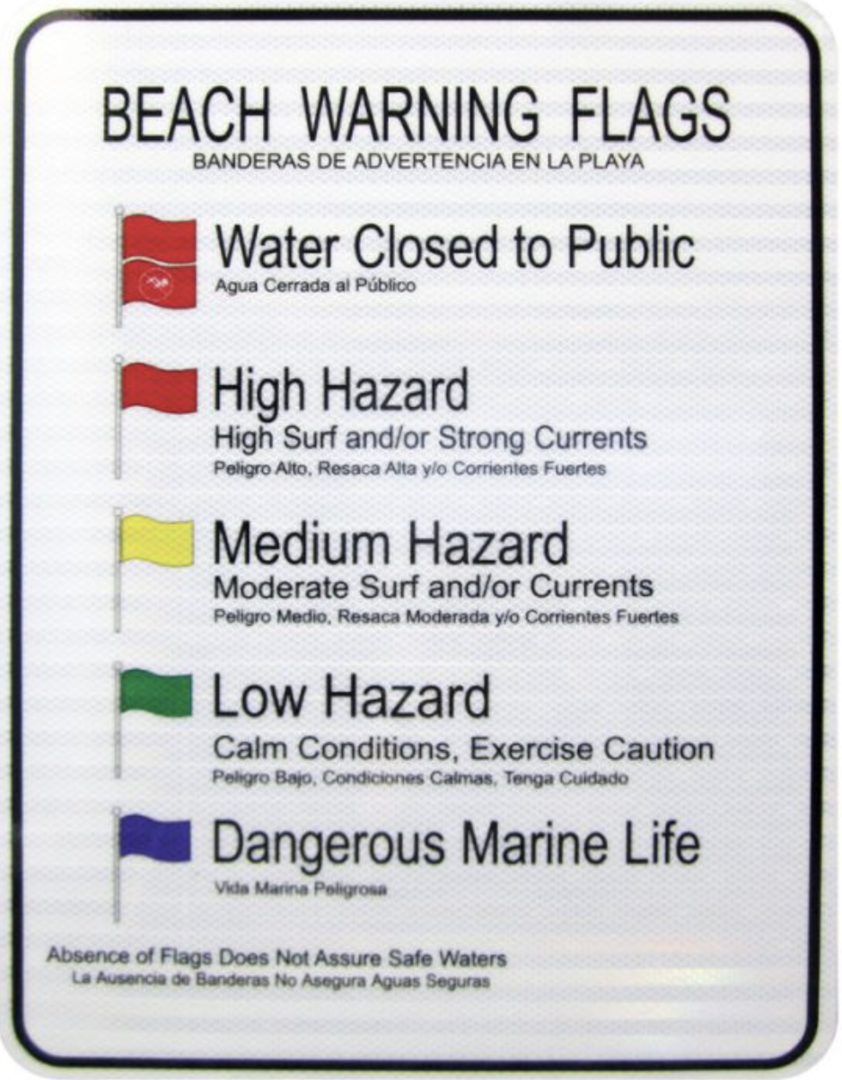 The beach warning flag program uses the colors adopted by the International Lifesaving Federation, with symbols added to clarify the meaning of the flags. The program also includes the placement of interpretive signs along the beach to explain the meaning each flag used in the warning system.